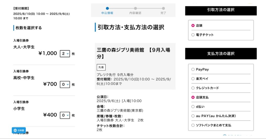 門票採用預約制,目前英文/日文購票均委託給日本Lawson連鎖便利超商做為獨家購票管道