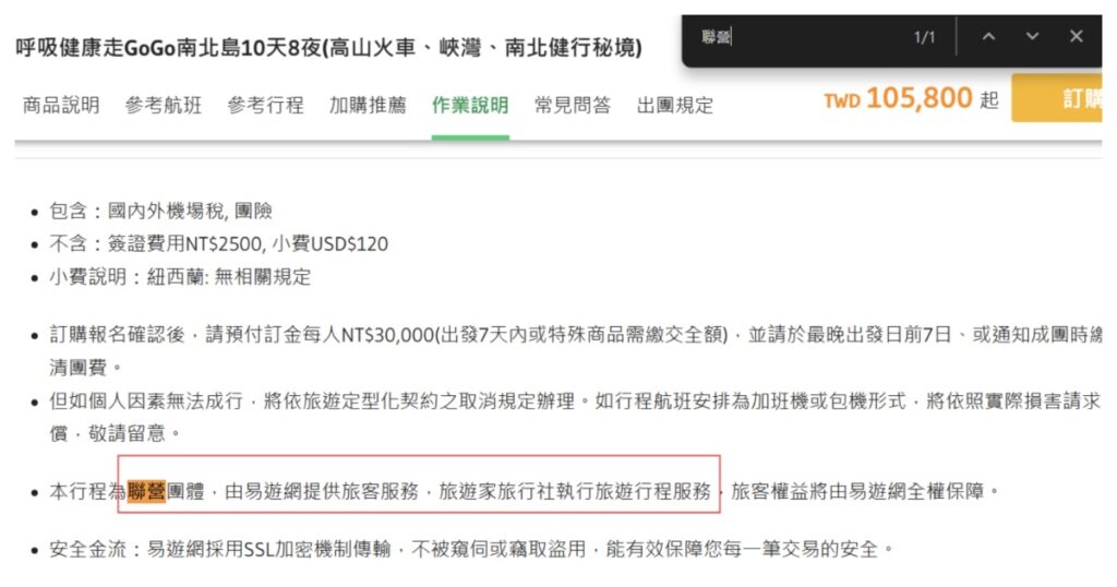 進到產品頁面,若要確認出團旅行社,則按Ctrl+F 查詢 聯營,自動帶到下方聯營團體說明,就可查詢到出團旅行社是哪一家