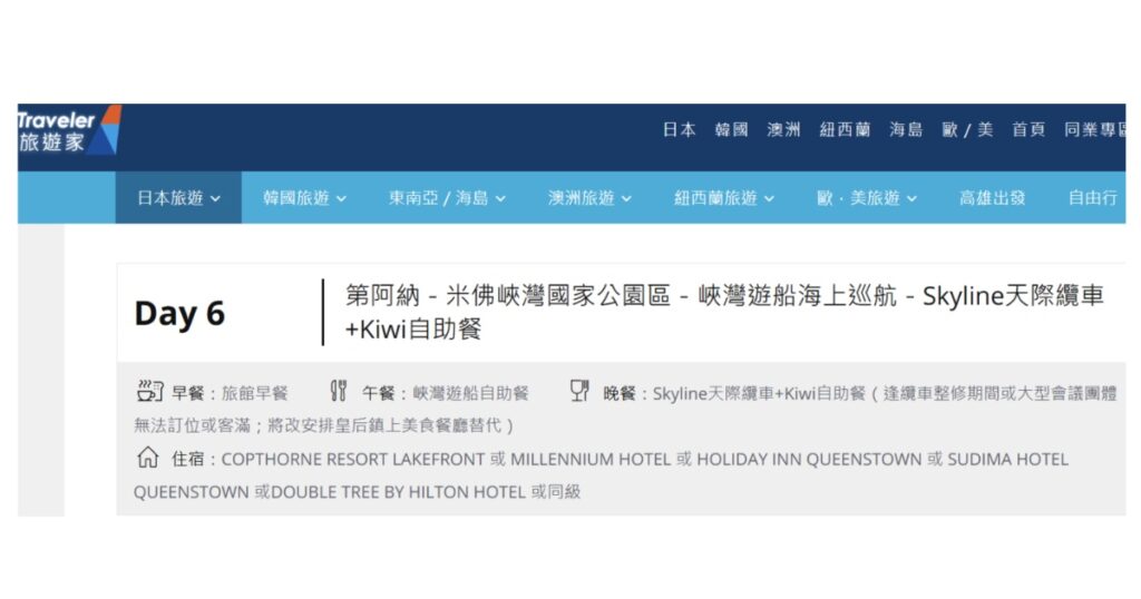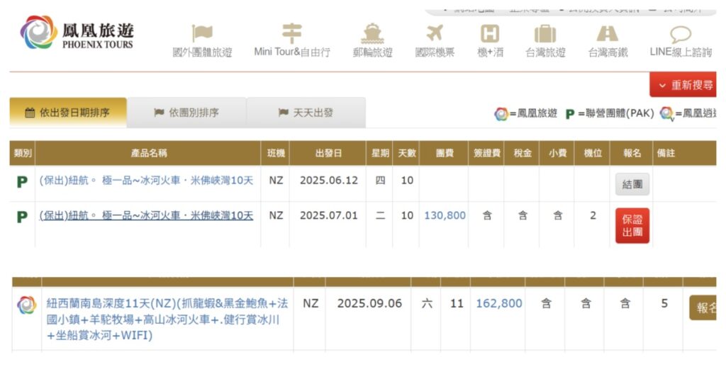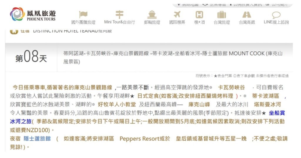 進到鳳凰旅遊官網,點選紐西蘭館頁,可看到紐西蘭各式商品,但其中也參雜聯營商品